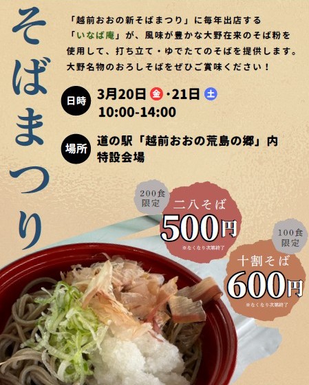 大野市で開催される「越前大野そばまつり」に毎年出展している「いなば庵」が、風味豊かな大野在来のそば粉を使用して”打ち立て!ゆでたて!“で提供します。